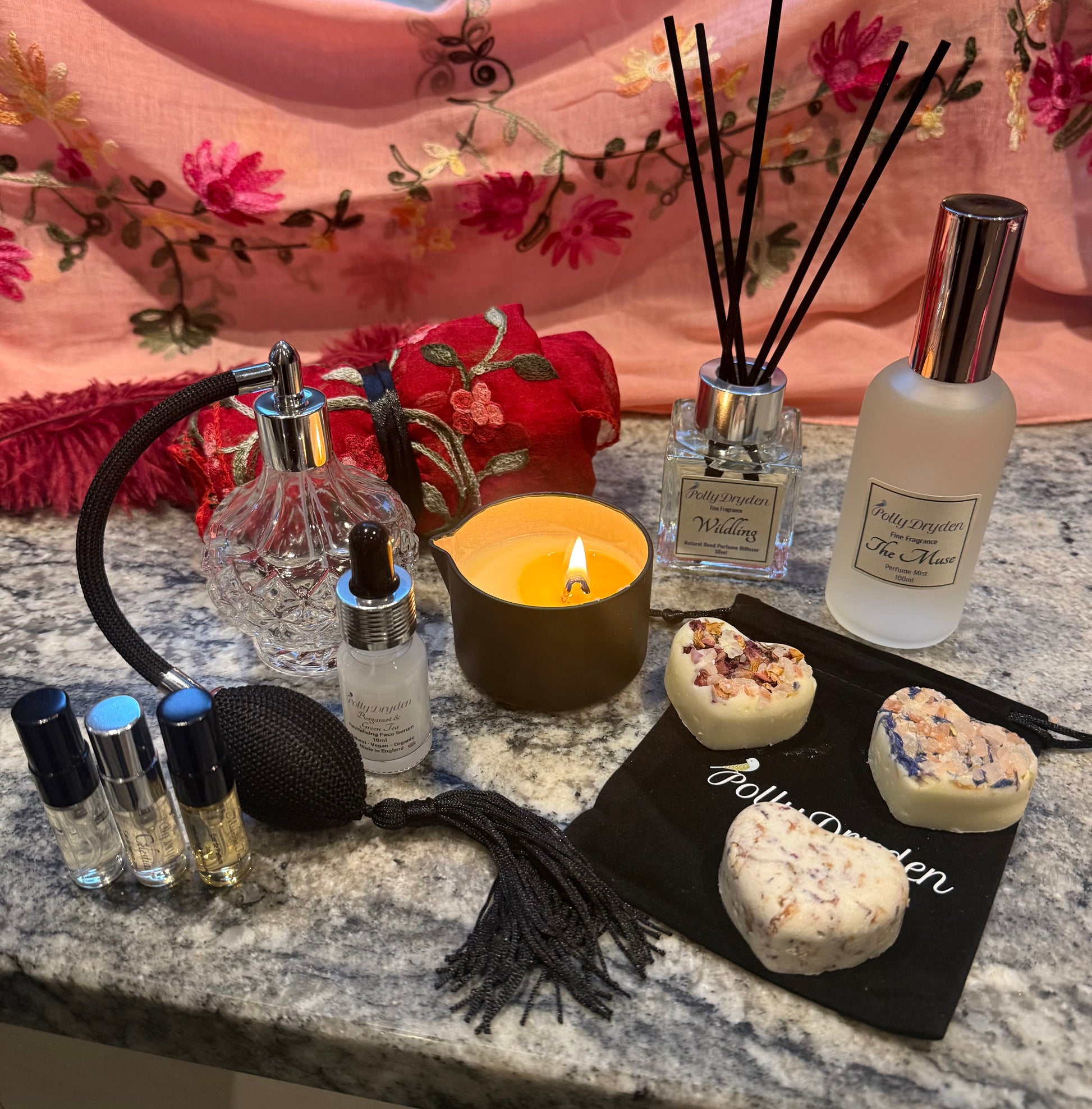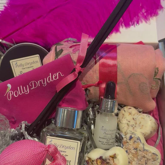 You Can Choose from 3 colour edits: Classic Black, Vintage Red or Hot Pink. This denotes the scarf colour that you will receive. Each box is individually styled with feathers and atomiser colours to present an element of surprise! If you have a specific request for either Oriental Garden or The Muse perfume Mist please drop me an email after placing your order hello@pollydrden.co.uk